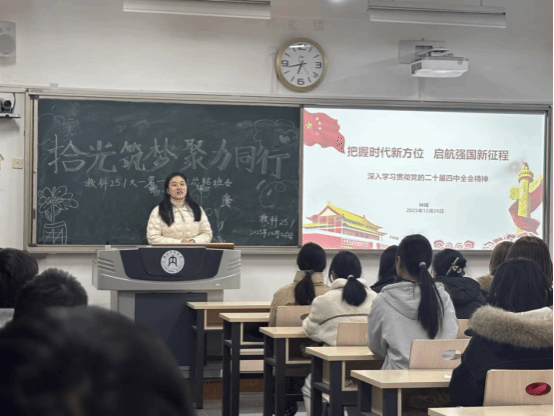 为深入学习贯彻党的二十届四中全会精神,落实学校领导干部联系班级制度,12月26日,学校后勤处副处长钟娟在明德楼B116,深入联系班级—教育科学学院教育学专业2025级1班班会现场并为同学们讲授专题党课。