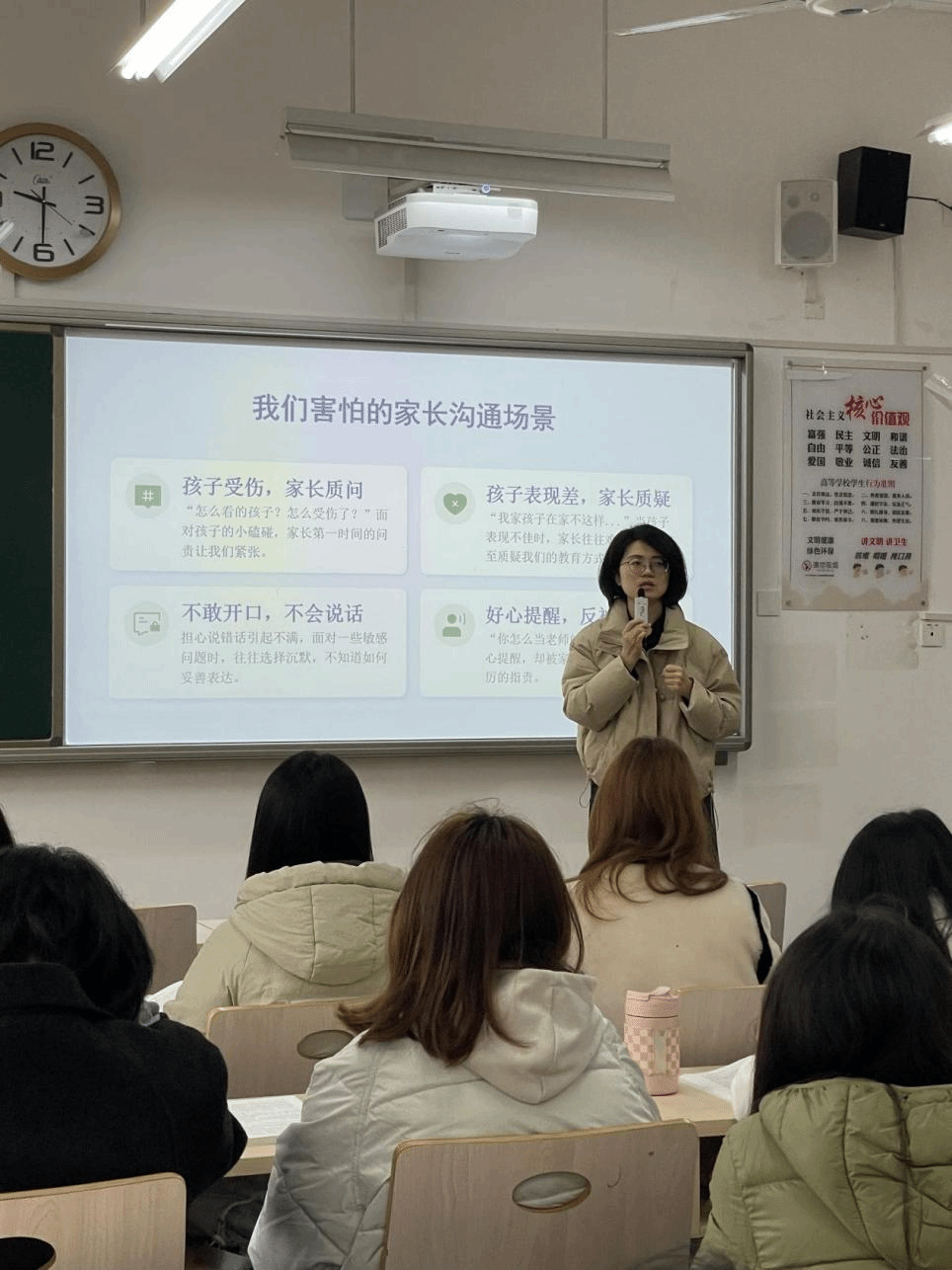 随后,围绕“实用、落地、易上手”原则,拆解家园沟通的核心逻辑,提出了“三不说,三要说”的黄金沟通原则。她着重强调,与家长沟通时要坚决避免贴标签、指责家长、情绪化表达等误区,始终坚持说事实、说观察、说建议,以真诚、专业的态度搭建家校信任桥梁。同时分享了3句万能“不被怼”沟通句式,语言通俗、逻辑清晰、层层递进,帮助同学们快速抓住沟通精髓,轻松掌握可直接应用的沟通方法。