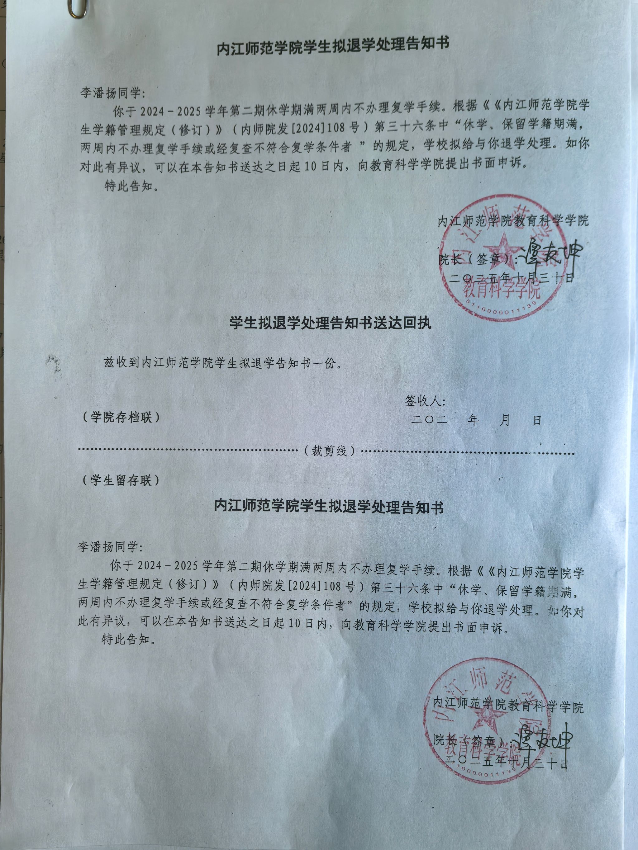 根据《内江师范学院学生学籍管理规定(修订)》(内师院发[2024]108号)第三十六条中“休学、保留学籍期满,两周内不办理复学手续或经复查不符合复学条件这”的规定,经学院研究决定,对符合退学条件的李潘扬作出退学处理。
