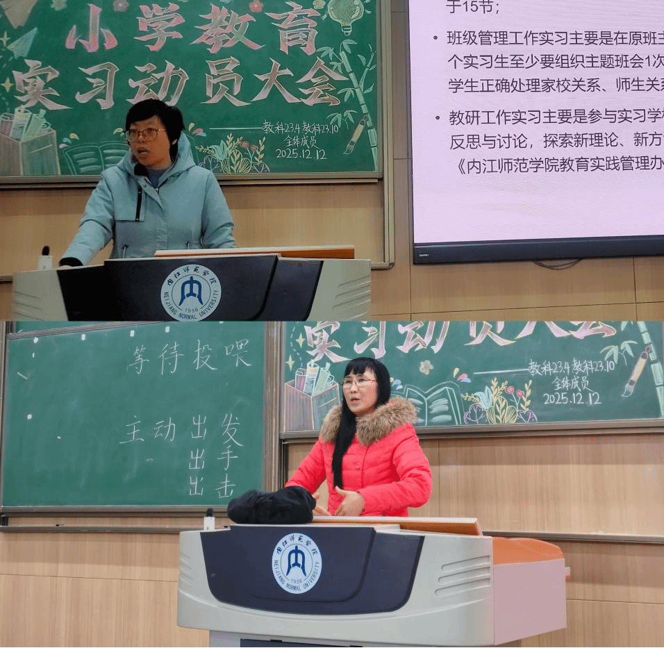 2025年12月12日,我院小学教育专业在明德楼B111教室召开23.4班和23.10班的实习动员大会。我院副院长谢红雨博士、龙海霞教授,教育实践课程团队负责人张青老师及班主任苟远萍老师、肖田老师出席本次会议。